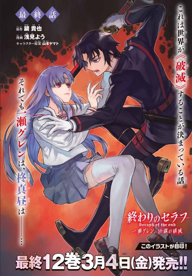 - This chapter marks the end of Seraph of the End: Guren Ichinose: Catastrophe at Sixteen manga, adapting the last chapter of Seraph of the End 7: Guren Ichinose: Catastrophe at Sixteen.