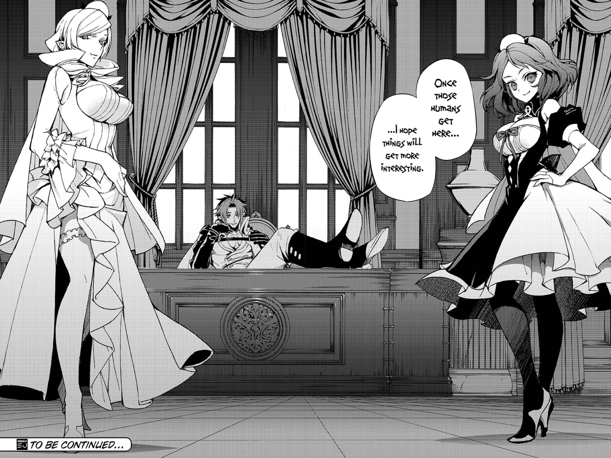 When Horn speculates that the humans may be preparing an attack strong enough to wipe out all of them, Crowley agrees but considers that the humans may have an entirely different objective. Creating an aim of his own, Crowley decides to capture one of the humans as a souvenir for Ferid. Both Chess and Horn mention they do not like Lord Ferid because he is devious and hard to predict, even for them. In response Crowley counters that there is never a dull moment with Ferid. Directing Chess and Horn to ignore the grunts, Crowley states to grab one or two of their more knowledgeable officers.