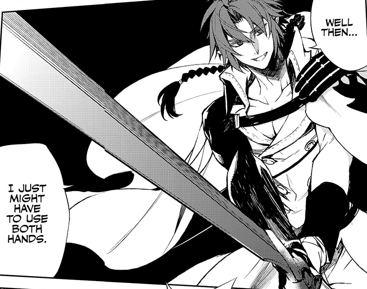 As Shinoa is warning her squad that Crowley is armed with a first-class weapon, with his rapid speed he quickly appears behind her before she can finish talking. Where Crowley would have had Kimizuki defended Shinoa, his sword arm is cut off first by Yu. In response, Crowley smiles, complements them, and asks who they are. His unreasonably chill response unnerves Yu, but Crowley is genuinely curious.