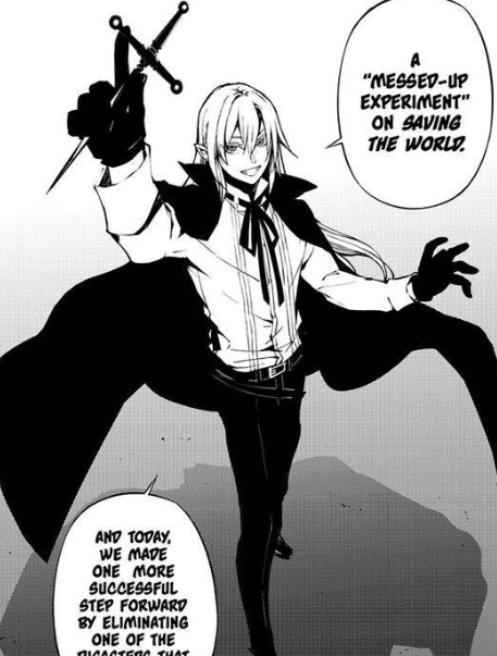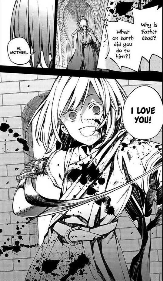 –Ignoring the fact it would not have occurred had Ferid not mortally wounded Mika, and moving the blame to Krul. Chapter 49: "Progenitor's Memory" | ||